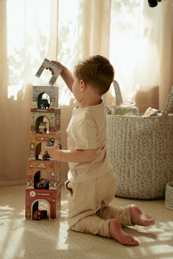 Dankzij het duurzame houten ontwerp en het compacte formaat is de stapeltoren niet alleen stevig en veilig, maar ook makkelijk op te bergen of mee te nemen. Of je kindje nu blokken stapelt, auto's parkeert of een stad in elkaar zet – deze set stimuleert op een speelse manier de fijne motoriek, coördinatie en het creatieve denkvermogen.